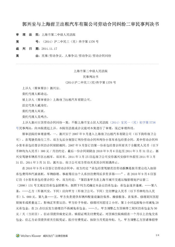 (2014)沪二中民三(民)终字第1376号-郭兴安与上海前卫出租汽车有限公司劳动合同纠纷二审民事判决书_页面_1