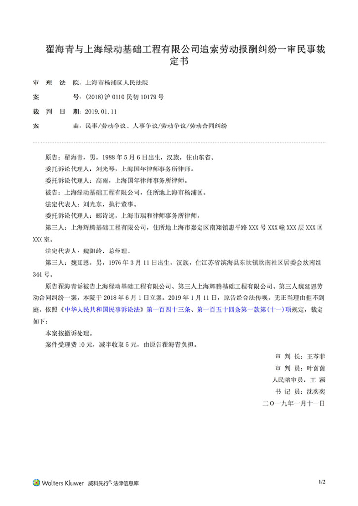 (2018)沪0110民初10179号-翟海青与上海绿动基础工程有限公司追索劳动报酬纠纷一审民事裁定书_01
