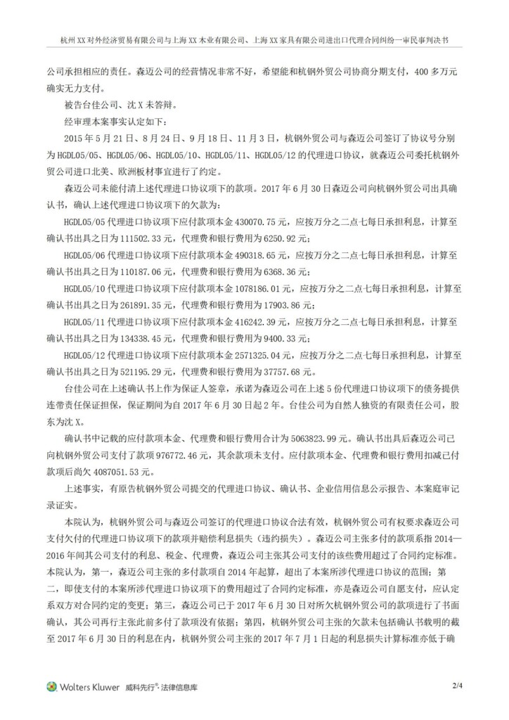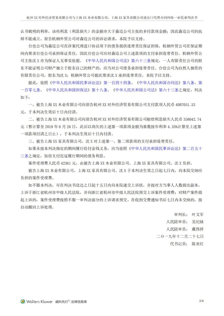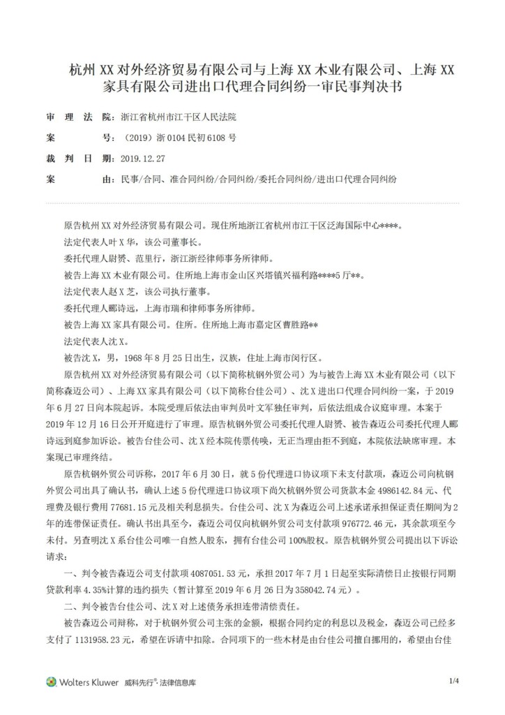 (2019)浙0104民初6108号-杭州杭钢对外经济贸易有限公司与上海森迈木业有限公司、上海台佳家具有限公司进出口代理合同纠纷一审民事判决书_01