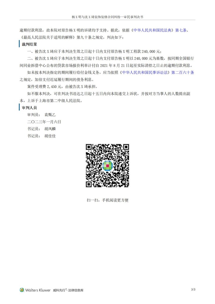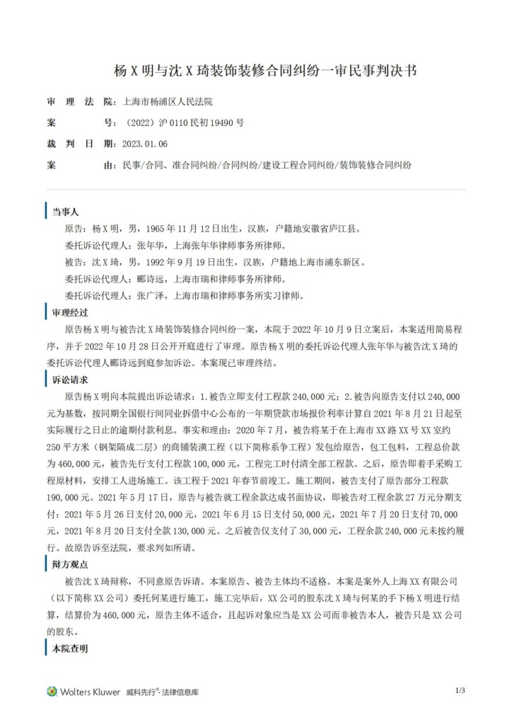 (2022)沪0110民初19490号-杨邦明与沈嘉琦装饰装修合同纠纷一审民事判决书_01