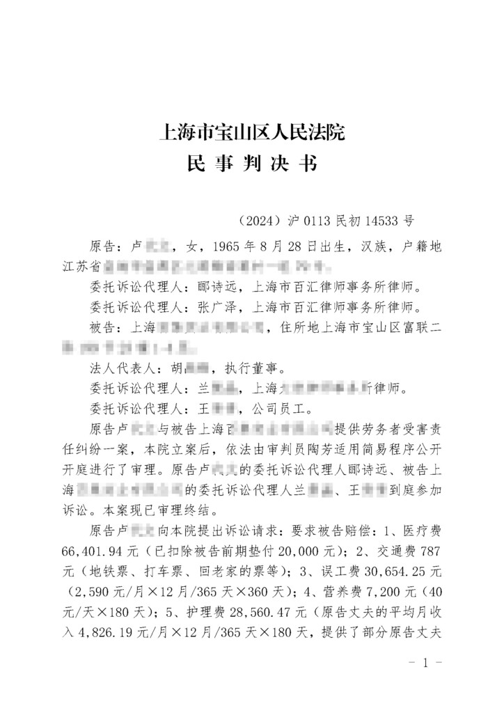 (2024)沪0113民初14533号-卢代文与上海百集实业有限公司提供劳务者受害责任纠纷民事判决书_页面_1