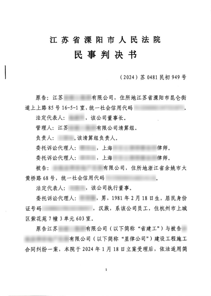 (2024)苏0481民初949号-江苏建工集团有限公司与余姚星律房地产发展有限公司建设工程施工合同纠纷民事判决书-1