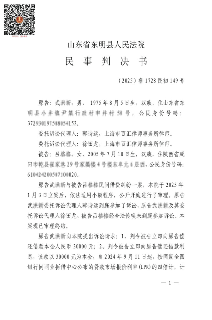 (2025)鲁1728民初149号-武洪新与吕格格民间借贷纠纷民事判决书_页面_1