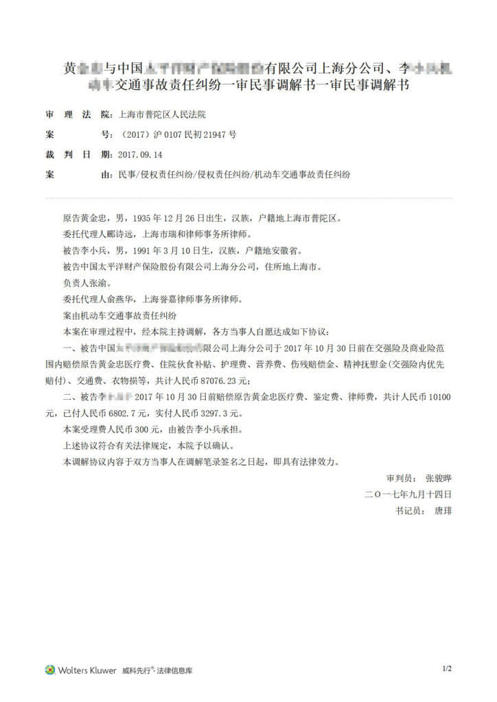 (2017)沪0107民初21947号-黄金忠与中国太平洋财产保险股份有限公司上海分公司、李小兵机动车交通事故责任纠纷一审民事调解书一审民事调解书_01