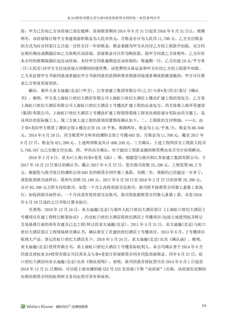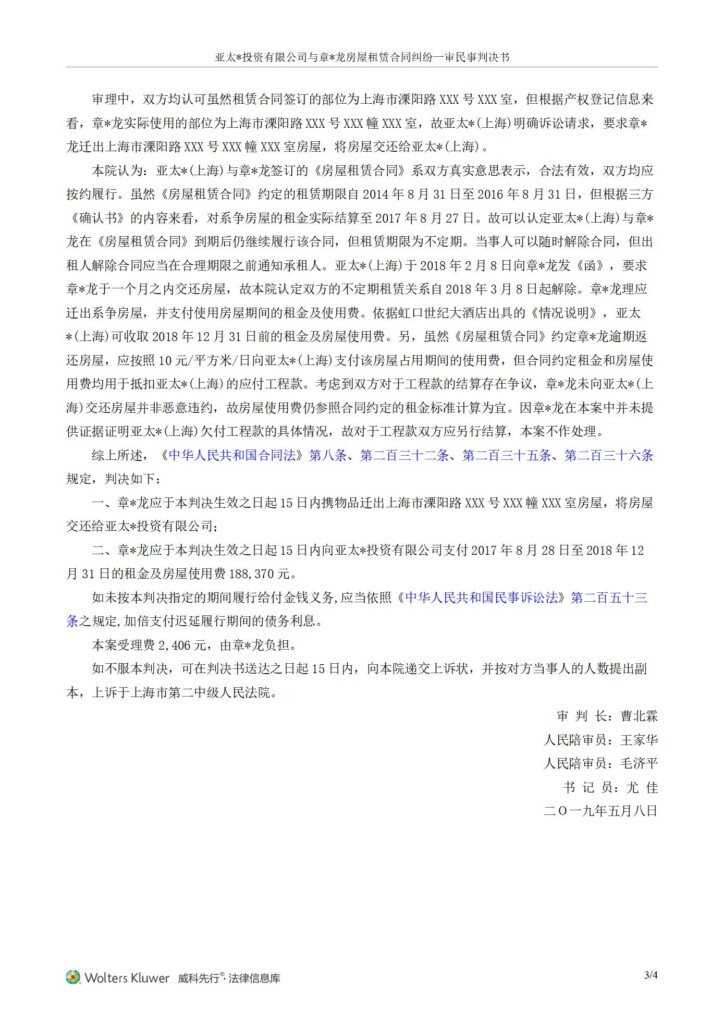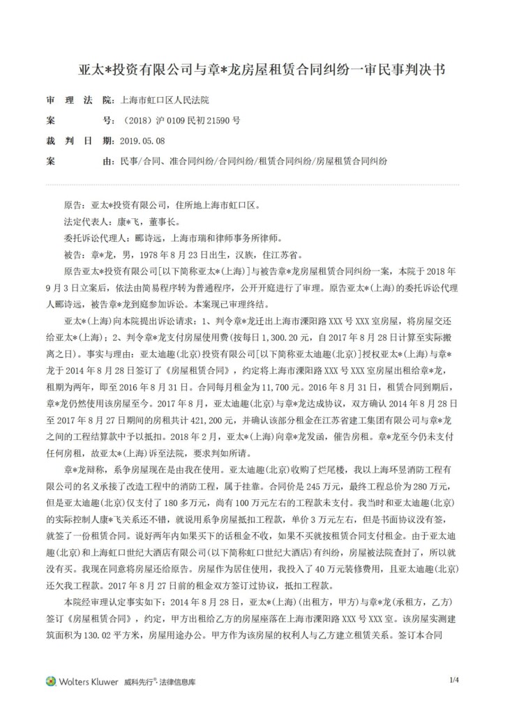 (2018)沪0109民初21590号-亚太迪趣(上海)投资有限公司与章海龙房屋租赁合同纠纷一审民事判决书_01