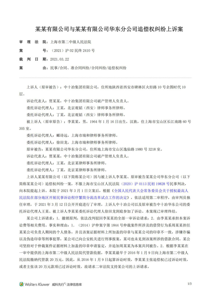 未标题-1_0005_(2021)沪02民终2410号-中十冶集团有限公司与中十冶集团有限公司华东分公司追偿权纠纷上诉案_00