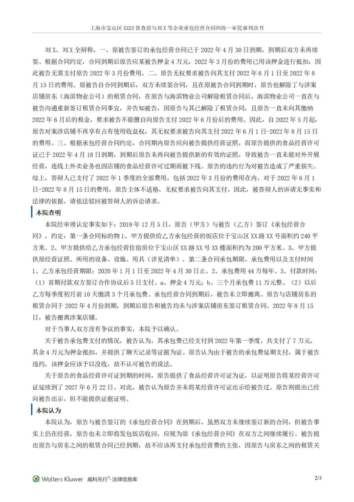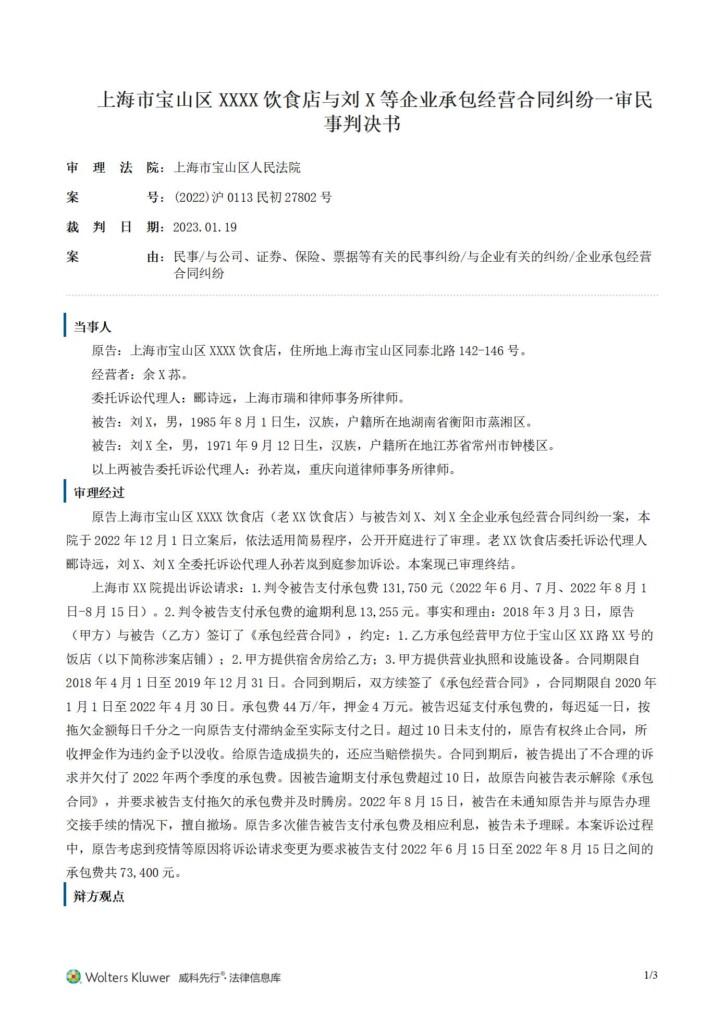 (2022)沪0113民初27802号-上海市宝山区海滨老四川饮食店与刘文等企业承包经营合同纠纷一审民事判决书_01