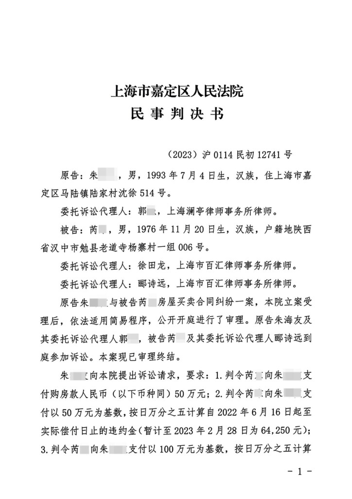 (2023)沪0114民初12741号-芮某与朱某某房屋买卖合同纠纷民事判决书