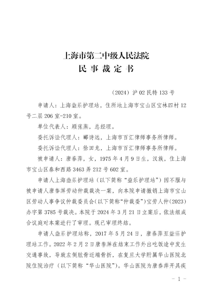 (2024)沪02民特133号-上海益乐护理站与唐春萍劳动仲裁民事裁定书_00